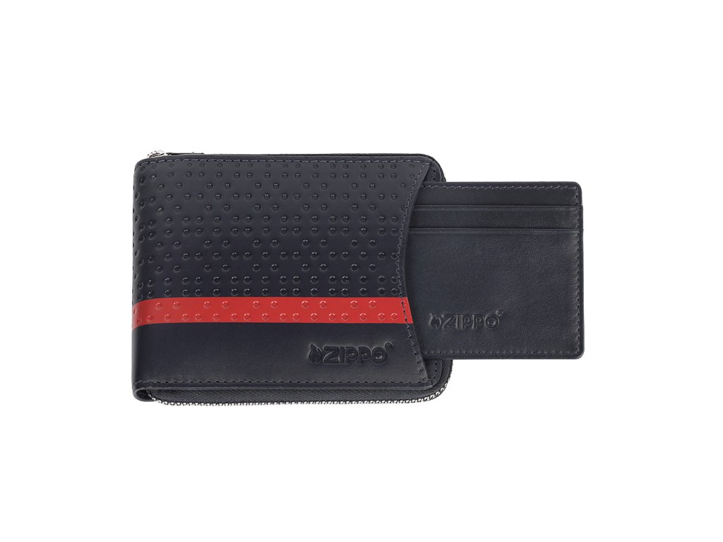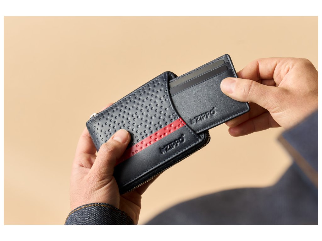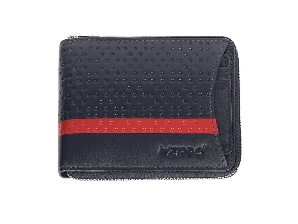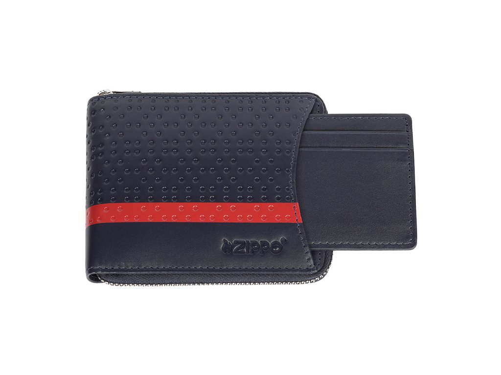Ideální pro váš aktivní životní styl, peněženka Navy Blue s odnímatelným držákem karet od značky Zippo dodá vašemu šatníku sportovní nádech díky embosovanému texturovanému povrchu a výraznému červenému pruhu. S vestavěnou kapsou na mince a odnímatelným držákem karet tato peněženka z pravé kůže nabízí dostatek prostoru pro bankovky, mince a kreditní karty, uzavírání na zip, technologii blokování RFID a decentní značku Zippo.